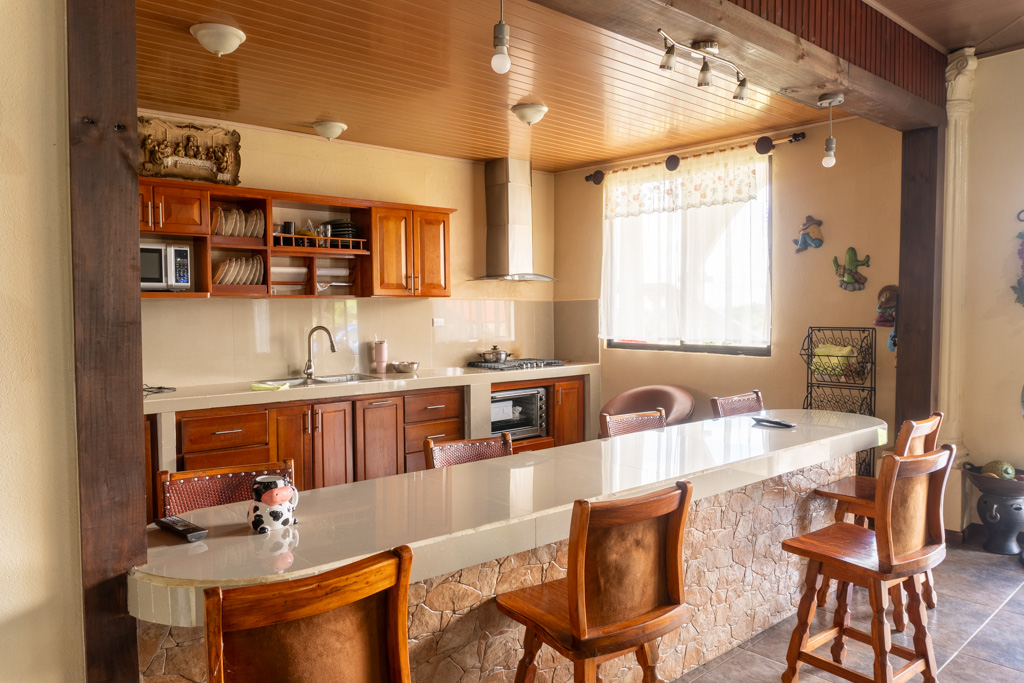 Cocina con muebles aéreos y desayunador.